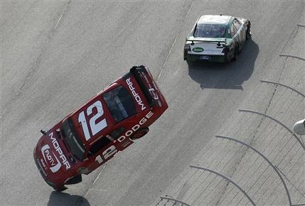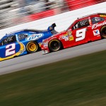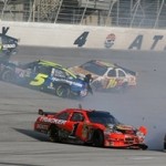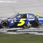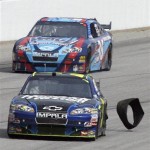 With 66 laps to go Jimmie is battling Kurt Busch for second. Jimmie said the car was “pretty damn good”. Jimmie just got very loose coming off four, but is still trying for second. 57 laps to go Denny came in with a tire problem. Dale Jr is 30th, two laps down and has a loose race car. Green flag pit stops are due within the next ten laps. Burton and Bill Elliott got pit penalties, Burton for speeding and Elliott for missing lugnut. Denny Hamlin says they’re right on with fuel, with none to spare. Jimmie has the same issue as the 24. We’re under caution. Denny’s cut down a tire which threw off some debris. Its a debris caution. Kurt wins the race off pit road. Jimmie lost three spots, he was over the line, they had to back him up and then they had (according to DW a sloppy pit stop). 35 to go right now, under caution. On the restart (lap 33) the 19 and the 13 hit the wall. the 13 has a right front tire going down. Somebody hit Elliott Sadler and he got turned into Max Papis. Mark Martin gets the free pass. Jimmie comes onto pit road. Chad asked if he felt anything rubbing, Jimmie said no, and Chad brought him down anyway. Jimmie ran into Newman, he didn’t know he was on the outside of him. They think something was rubbing after the contact so they brought him down to fix it. Bristol is in two weeks. About 30 laps to go. smoke is on pit road with 19 to go to replace right side tires. 10 to go with Kurt Busch leading and JPM and Kasey bringing up second and third. Catuion! Brad Keselowski flipped. Carl Edwards flipped him! Brad is