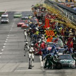 They’re guestimating that either Chad Knaus asked them to wait until the next lap to pit and/or they wanted five points for leading. Larry Mc thinks its a bit of both. Lap 121 everybody is driving by Jimmie Johnson on this restart. He started in fifth and is now in seventh. The tire specialist wrote “Goodyear check dismount 88” on the tire that came off BooBoo’s car. Big Daddy is motoring thru the field right now. Just took over fifth from Kenseth. Denny is chasing JPM for second. Kurt has checked out it appears. Jimmie has caught the 24 for sixth. Kurt is the leader by one second on lap 130 of 325. A member of Biff’s pit crew found a horseshoe last week and they have it taped up in the pit box. Biff’s been gaining spots every pit stop. Kasey has been stuck in 4th -6th since the pit stop incident. Biff and Vickers top Mike Joy’s next-to-knock-down-the-wall list. Big Daddy has faded to 12th. Big Daddy said they’re in big trouble and he’s going to take care of their stuff and pray itcomes back. The track temperature has changed one degree since the start of the race. It’s remained overcast. Denny had gotten to within 3/10 of a second behind Kurt Busch and Kurt drove away and left him. Biff and Allmendinger battling for tenth. He’s been