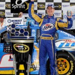 out of the car and limping a bit. Carl’s getting parked and is going to the hauler. Carl drovedown pit road the wrong direction to park his car. Brad said he lifted for him, but couldn’t lift fast enough for him. He apologizes for that but he couldn’t help it. He didn’t do it intentionally. Three laps to go. Clint Bowyer won the race off pit road, so he’s the leaderwith Menard in second. Kurt Busch and Jamie Mc are behind them. Kurt wins on the second green white checker. Kasey was in fourth. SpankBoy finished 10. Jimmie finished 12th. BooBoo finished 15th. Clint finished 23rd. Kurt is doing a victory lap backwards. Steve Byrnes said Kurt was told not to come to the garage so much because they couldn’t get work done. Kurt said it was important to him to see how Steve was delegating responsibilities and how he was being absorbed.