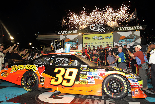Newman said Smoke told him he loved him. He said this is an emotional victory for him. This was the track for his first start and this is his first victory at Phoenix and a win has been a long time coming. Big Daddy said he spun the tires. Kenseth jumped ahead of Biff in the points. Clint is in sixth and Edwards is in seventh. There are questions as to whether Kyle and Dave Rogers are having good communications. Jimmie said the tires were a good call and were the right call. He said he was thinking about Martinsville and the four tires. Hammond said next week most likely owners, drivers, crew chiefs and engineers will be getting together and discussing how to make the right call in these situations, because they’re guessing at this point and making the wrong calls and costing themselves wins.