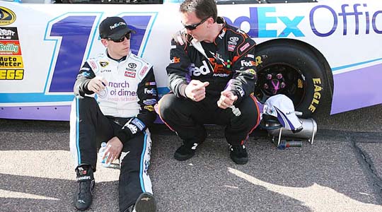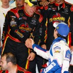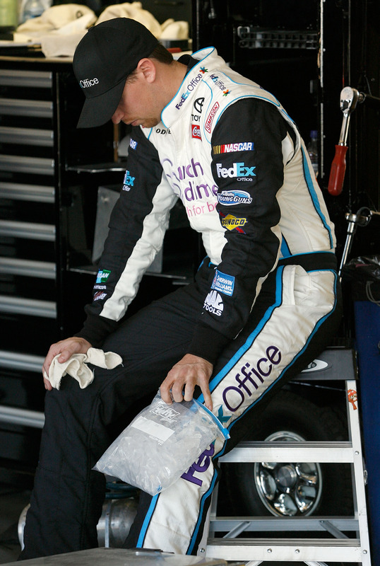 unlikely all day. The problem is that his sponsor is doing a big March of Dimes promotion today and therefore they’re really pushing for him to be in the car and for it to do well. He keeps repeating that he’s tough, but he has to be smart. Also during Race Day both Kyle and Kenny were proud of him for saying that and mentioning that he’s young and has a long career ahead of him, so he needs to take care of that knee, because if he doesn’t heal it well, his career won’t be as long.