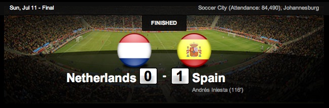Spain and Netherlands face each other for the World Cup final. Either would be a first time World Cup winner. Around the 118 minute mark, Spain’s Andres Iniesta scores. The Netherlands complained about various aspects of the play, but the score remained. With less than two minutes left Spain is down to 10 men due to one player going down with a hamstring injury. In Spain’s 13th appearance in the FIFA World Cup, Spain wins for the first time 1-0 against Netherlands.