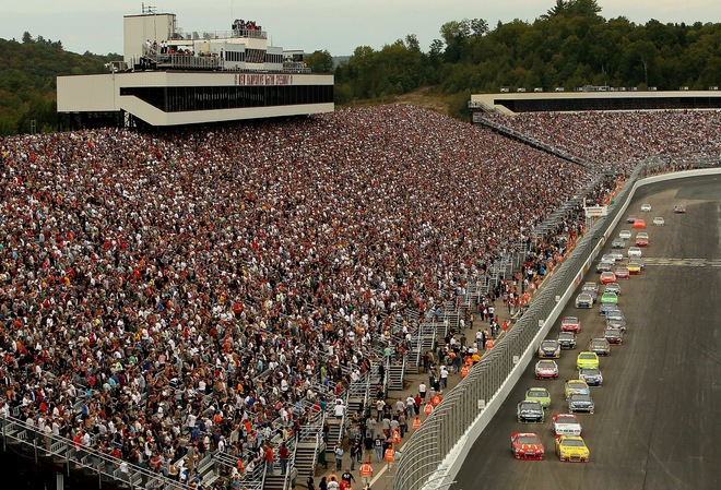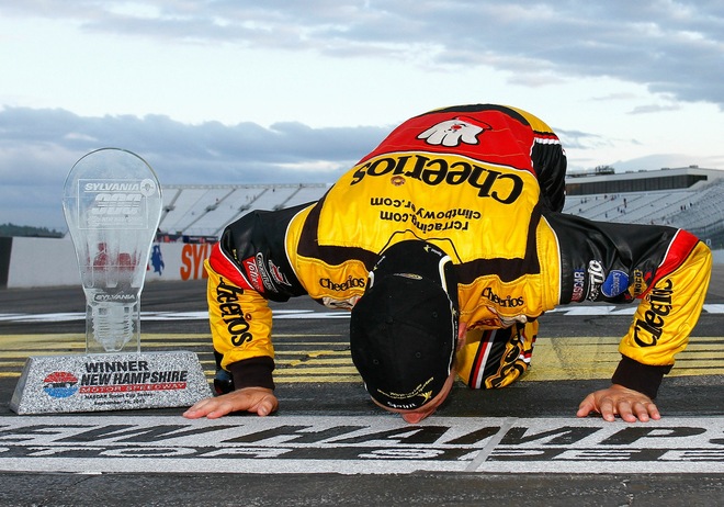New Hampshire has put a granite stripe in at the start-finish line. It’s the granite state and the track now has the granite stripe – I guess hoping for their version of kissing the bricks? And what the hell is this business of Marty beginning a sentence with ‘Driver X’ says, “blah blah blah something stupid/juvenile/cliché/inappropriate”. To whom is this guy related??? Or with whom is he engaged in sexual congress or illegal activities? There has to be a reason that he has this job! It most certainly has nothing to do with talent or professionalism.