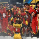 Going back to green with 63 laps to go. Clint spun the tires of the restart and lost a few spots. Jimmie is in hell with Kurt, Carl and Biff, Montoya, Elliott Sadler and Kyle ahead of him and Allmendinger and Ragan around him. Clint says his car is so loose he’s just trying to hang on. Caution is out with Logano and Elliott Sadler spinning around – probably courtesy of Kurt Busch. Yep, Kurt got lose and into Logano, Elliot came down on Jimmie trying to avoid Logano. David Ragan got the free pass. JPM, Biff and Busch are pitting. Kenseth is in as well for a stop.