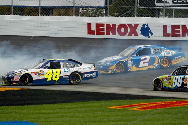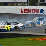 There were about 75 laps to go when the wreck occurred. 72 laps to go now. Petree thinks the first three may have hung themselves out with their strategy. Jimmie is a couple spots behind Carl trying to get around AJ Allmendinger. Darien is counting on more yellow flags. There have been six chase contenders involved in the last two incidents. Carl is racing Kurt causing Jimmie to get stuck by Allmendinger who is doing his usual foolishness. Caution is out. Keselowski got into Kenseth and Kenseth hit the wall. 67 laps to go as we head to commercial break.